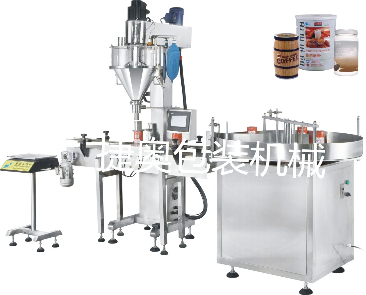 该机适用于粉末及小颗粒自动罐装,能完成瓶、罐自动定位、填充计量,它由螺杆计量机、链板输送机及一套气动装置组成;可与理瓶机、旋盖机、贴标机组成整套罐装流水线。
